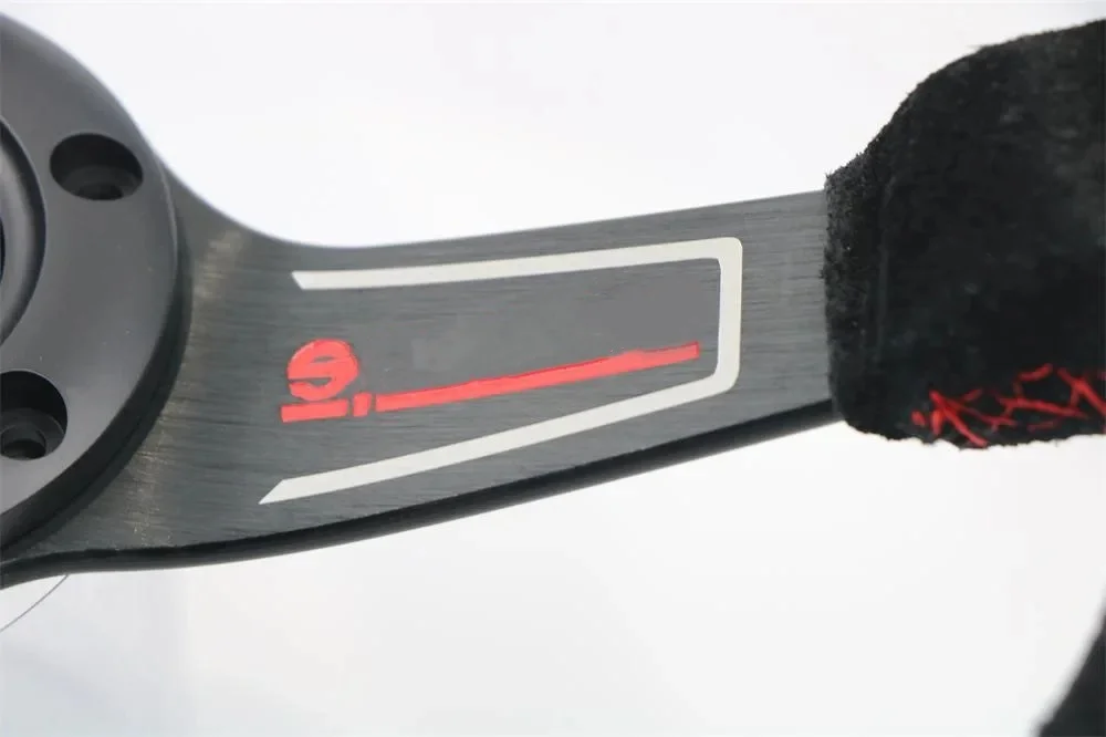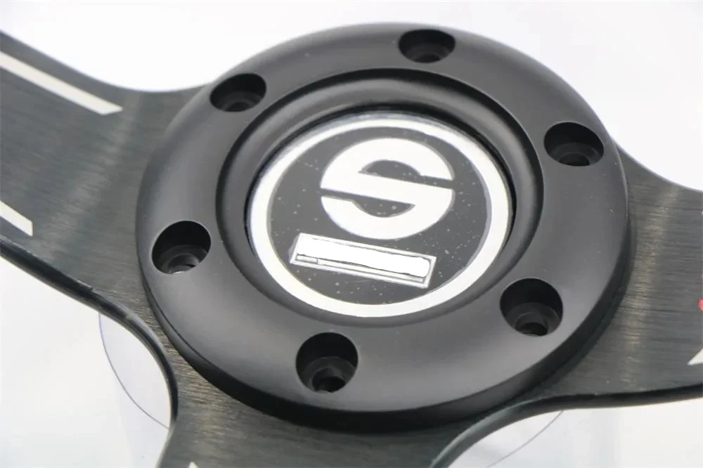O centro do volante é adornado com o logo “S” estilizado, que representa força, precisão e estilo racing, reforçando o visual esportivo e sofisticado do produto.