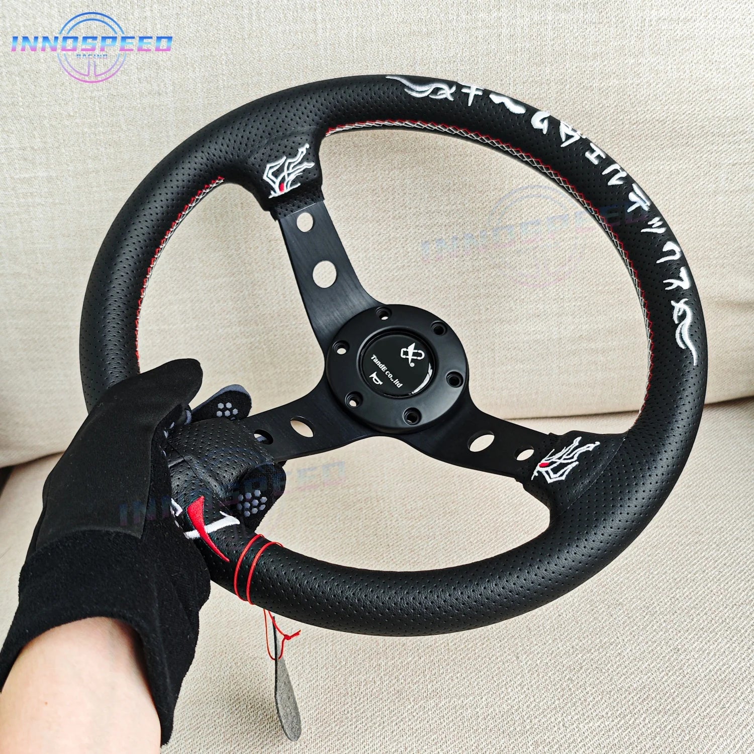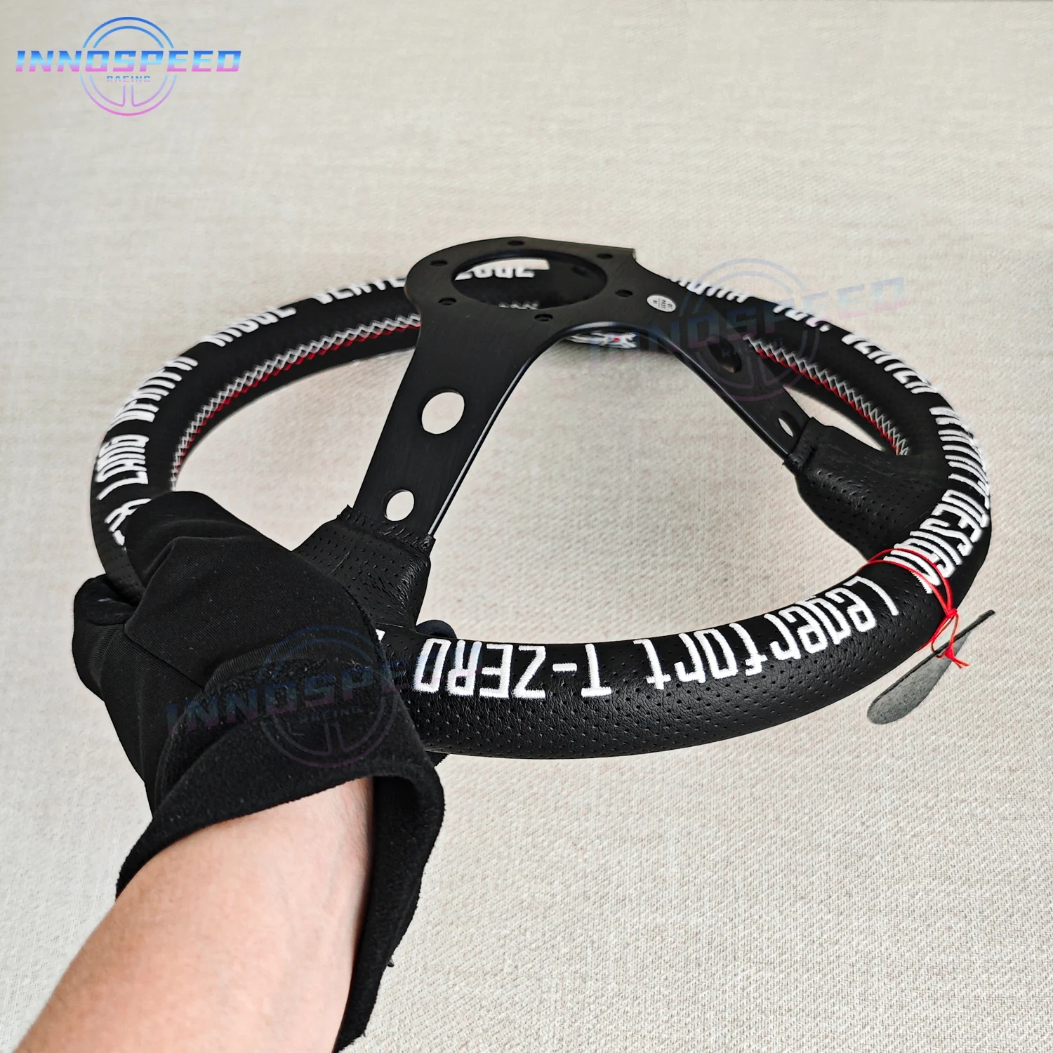 A costura reforçada em linha vermelha não apenas aumenta a durabilidade, mas também cria um contraste visual característico dos volantes racing JDM.